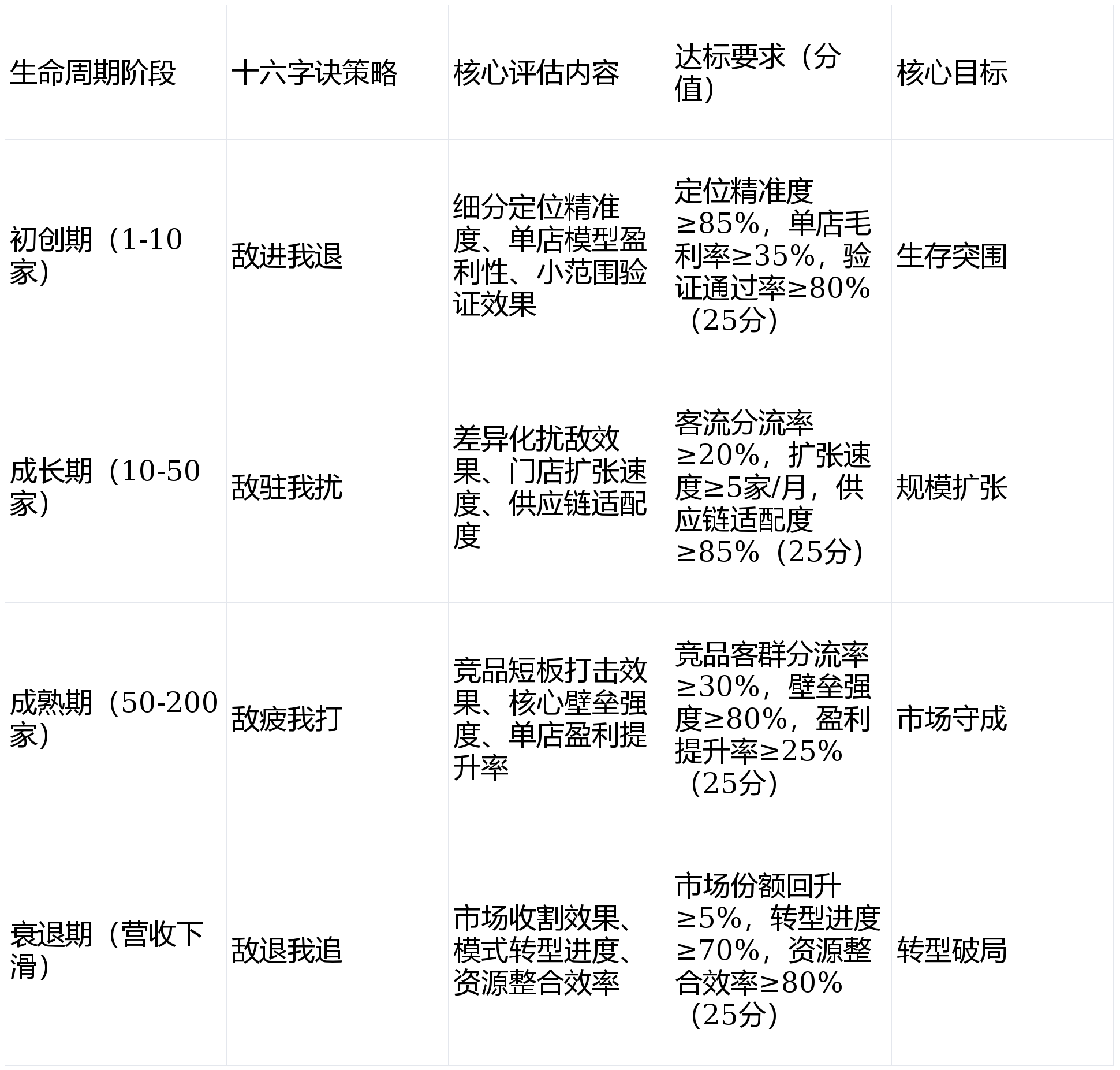 初创期:痛点1(正面竞争被动)—策略(敌进我退)—动作☆▽:聚焦细分赛道,避开竞品锋芒;痛点2(单店模型亏损)—策略(敌进我退)—动作…■▽:优化成本管控,提升单店盈利▷;痛点3(模型验证失败)—策略(敌进我退)—动作▲▪-:小范围迭代,调整模型适配市场○▲;