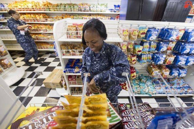 航母上负责超市工作的舰员正在商品上架,细节上能看到我们生活中超市里也多见的彩虹
