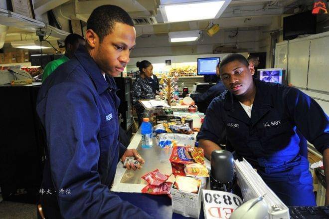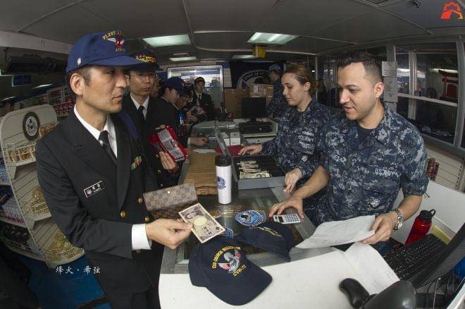 在上图中到访美国航母的日本官兵购物后使用的是货币◆■★,但在这城市里常住的舰员们日常是刷卡消费的。文/烽火·希弦